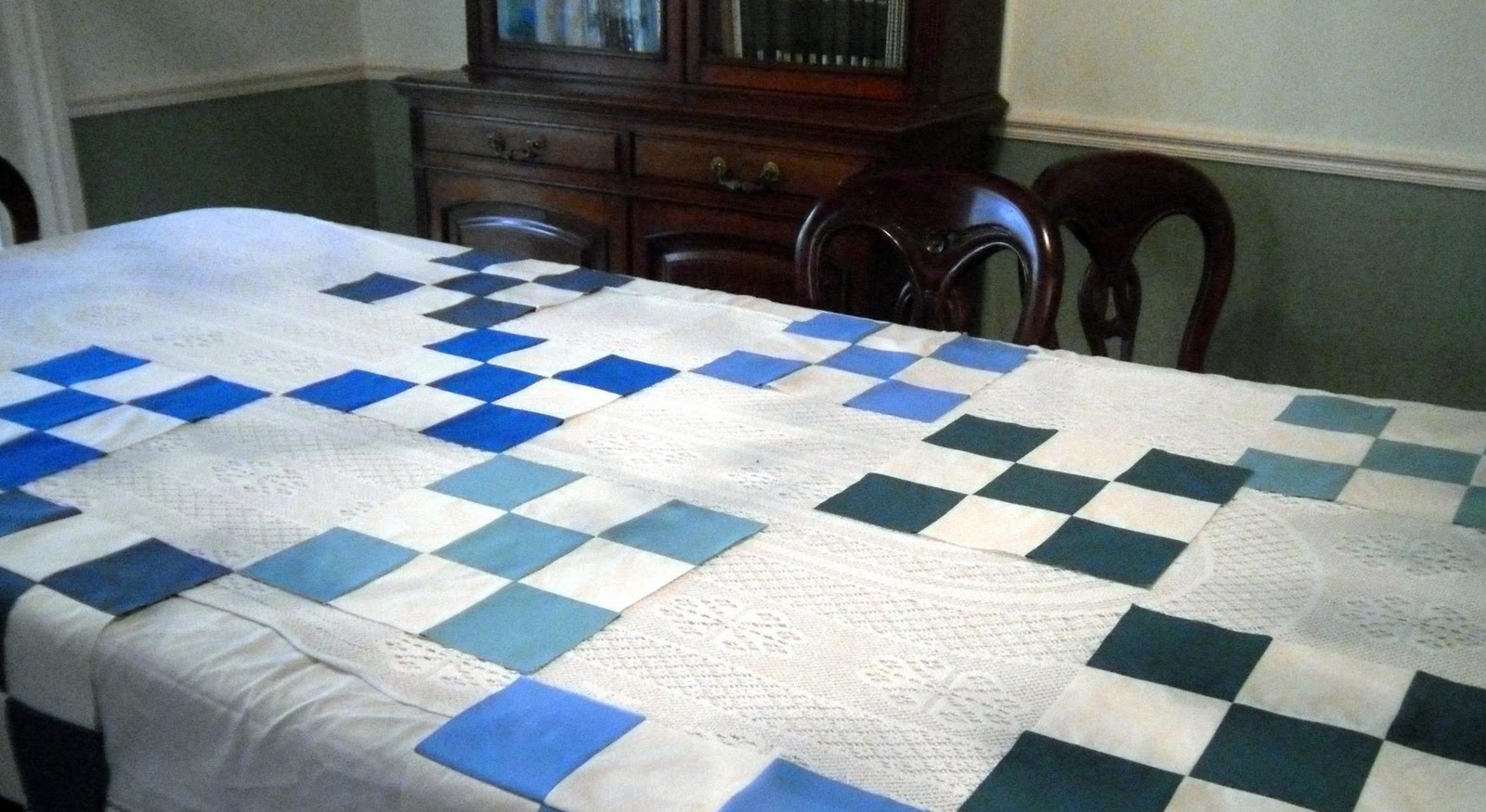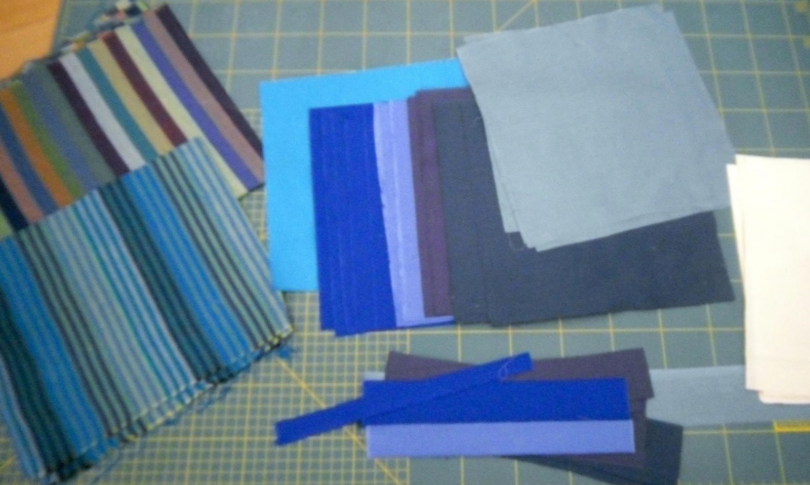 Talking of quilts, I’ve just started a new one. I decided to sort out what blues I had and then see what I could do with them. I found I had five FQs and some stripes so I started by cutting them into 10″ squares.