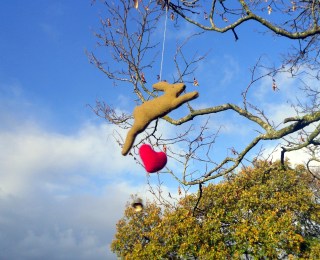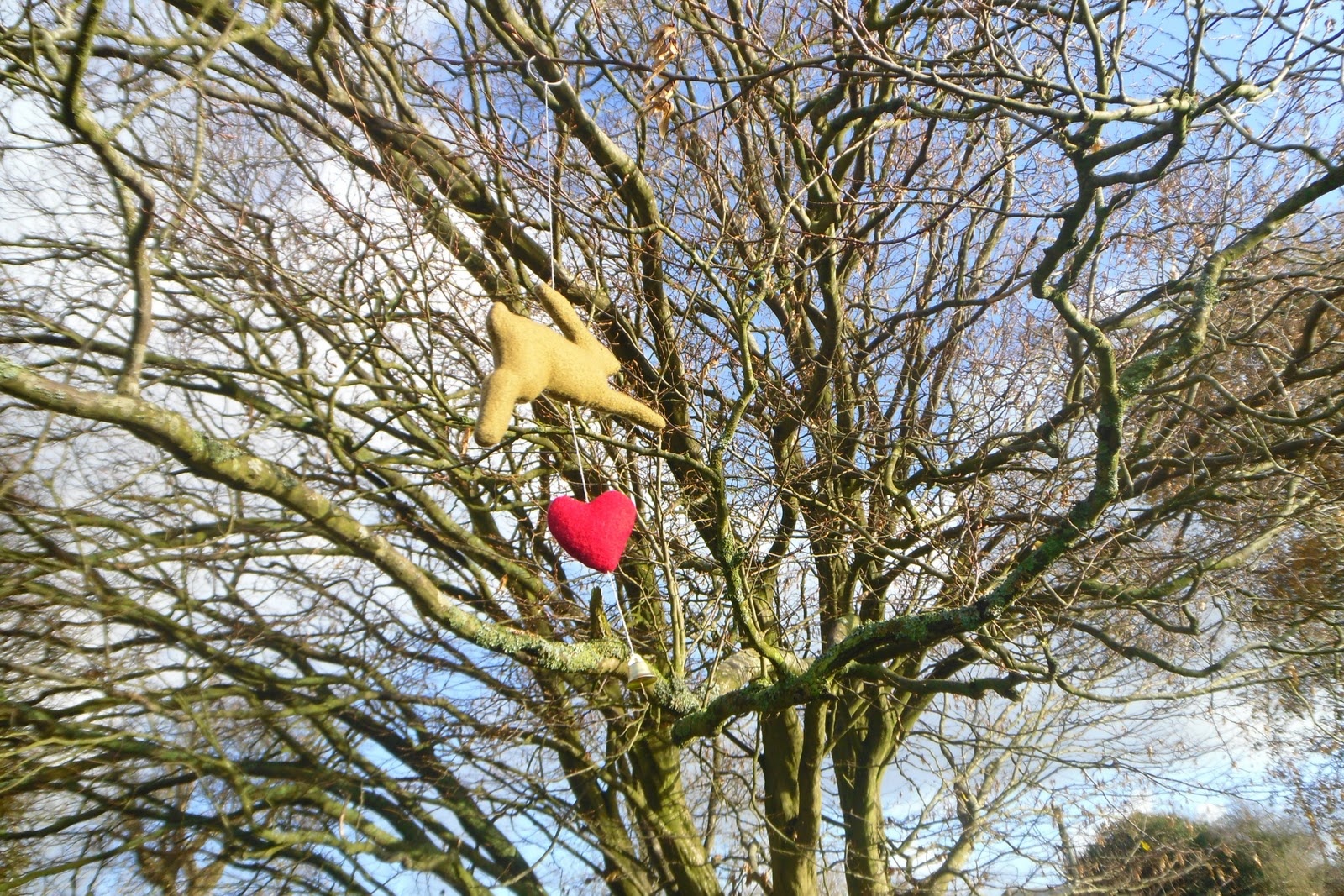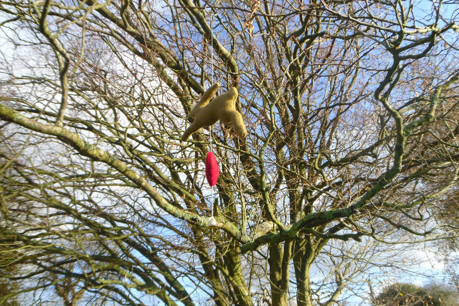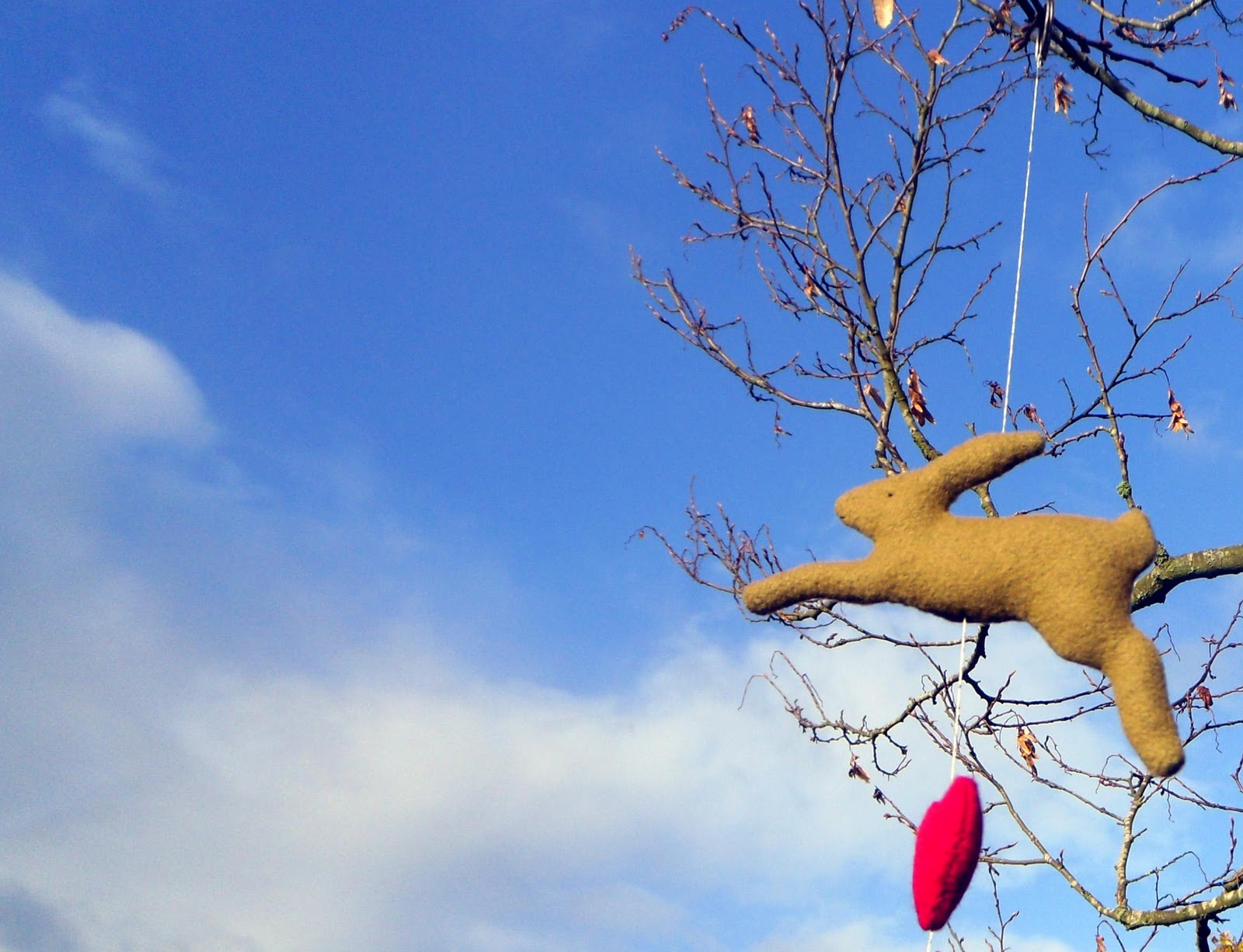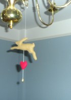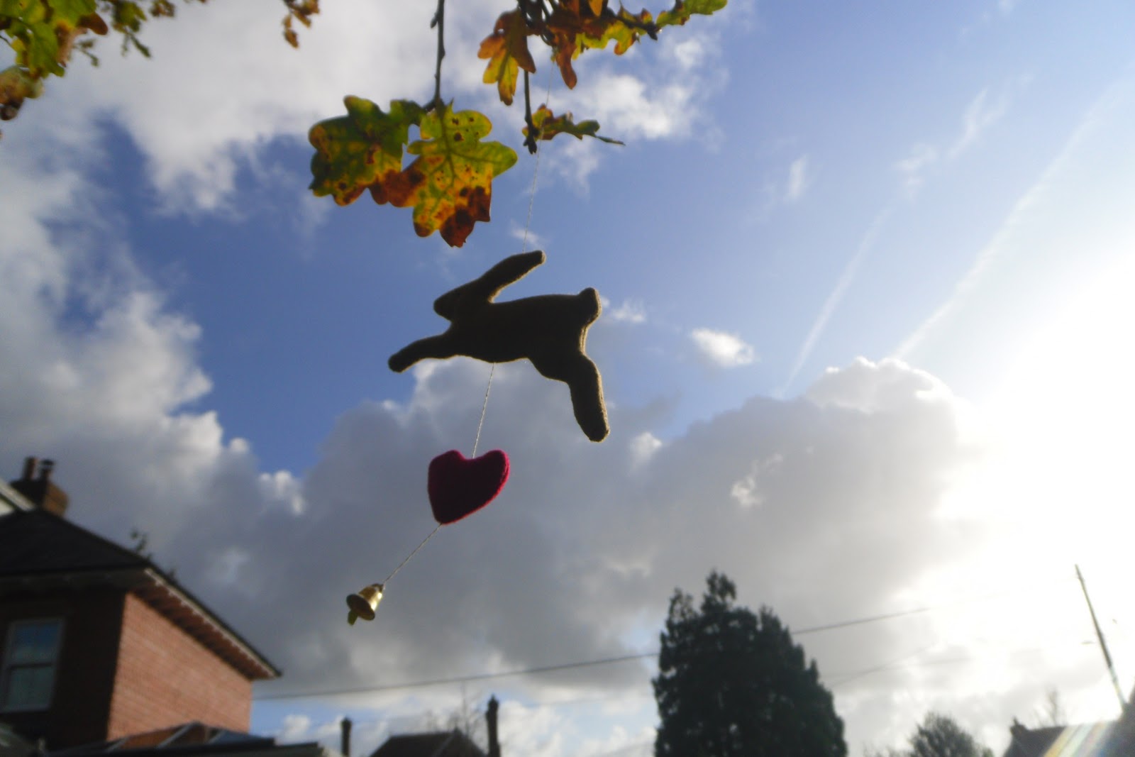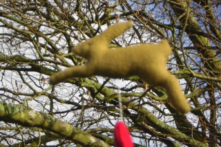And this morning I made a small brown hare. He is 6 inches long and I made a heart to hang under him and joined on a bell that I had left over from making some hanging birds last week.