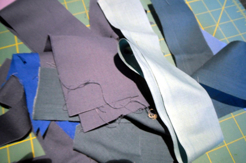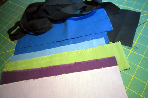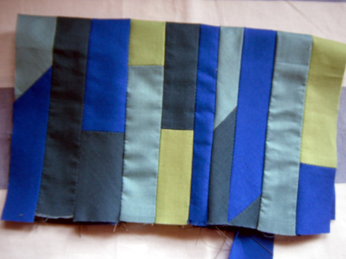 I imagined that if I kept sewing thin strips together I’d end up with a harmonic blended effect – but I just ended up with lots of bulk at the back and soon discovered fabric can’t be made to look like pen strokes in that way! (see right) So I moved onto using some Kona classics from a charm pack and decided to keep them in solid strips.