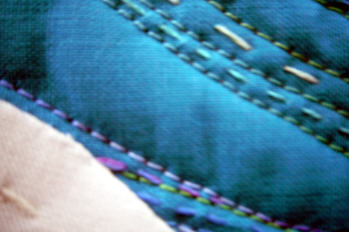 As with the Kona strips, I found the thread colours behaved in a surprising way. The darker and mid-range colours tended to disappear and it was the lighter purple and green from Vickki’s selection – which I had thought wouldn’t ‘go’ – which stood out. I haven’t hand stitched anything in at least ten years and a main practical lesson I discovered was that my eyesight seems to have deteriorated! I did this this stitching in the evening and was shocked the next morning, in daylight, at how uneven it is :( I was, however very pleased with the overall effect. I love this as a way of adding interest and detail and I’ll certainly be trying it again.