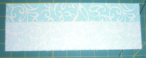 Take two 5×5 pieces (or one 10×5 piece) of your inside fabric from step 4 (above). Iron a 3.5 inch wide piece of interfacing onto the wrong side of your pocket fabric(s) aligning the interfacing with the bottom edge.