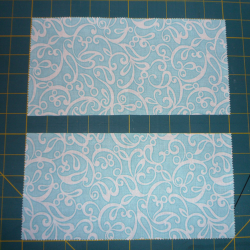 Take your inside fabric pieces. This step requires four 5 inch square pieces of fabric but I used a 10×5 inch piece and made the vertical cut after the next step.