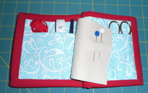 Take a strip of your binding fabric and sew on to cover the machine stitching line you sewed in step 9 (above). Now the outside of your sewing case should look like this…