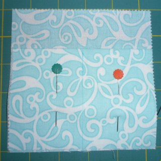 Assemble as in picture below: Place one 5×5 inch square of inside fabric face up. Place pocket face up on top of it aligning bottom edges. Secure with pins.