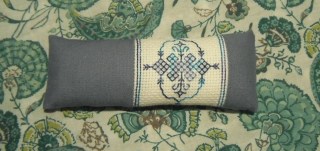 A little pin cushion made from a small piece of blackwork stitched in variegated blue/purple thread and a kona charm square.