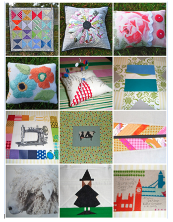 1. Biased Butterflies, 2. Dresden Cushion, 3. vintage pin cushion, 4. vintage embroidered pin cushion, 5. pin wheel pin cushion, 6. Benta’s Star, 7. Starter block for Free Form Bee, 8. Cow for Jen, 9. Feather for Lucy, 10. Sheep, 11. Little Witch, 12. Siggy Block for Lucy