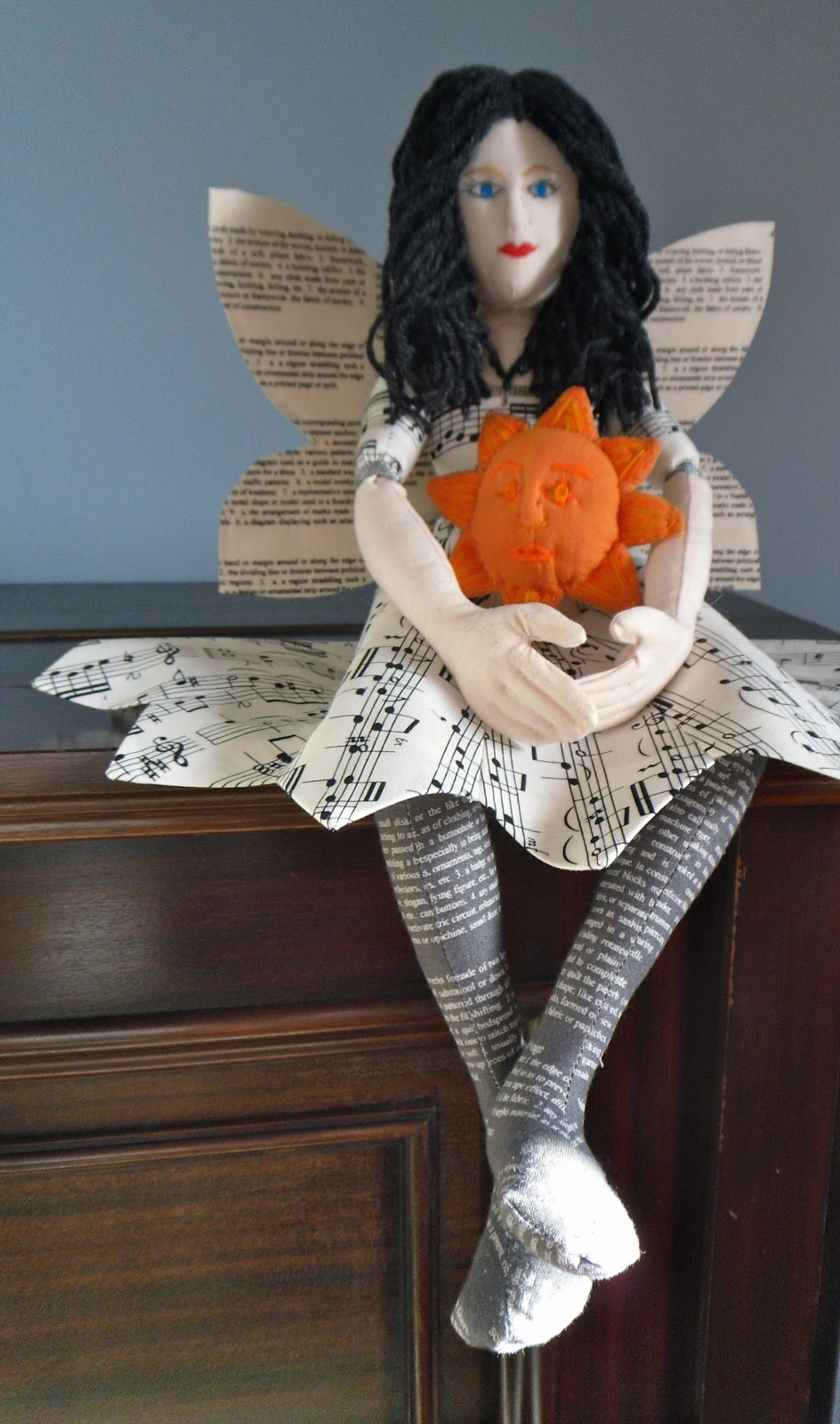 Her skirt is a partial dresden made from ‘Musical Notes’ by Timeless Treasures and her legs and wings are ‘Mama said Sew’ fabric. Hopefully, because her words are all sewing words she’ll not only charm the sun back but bring me good luck with sewing next year!