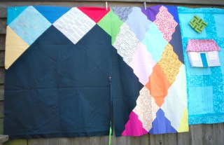 On the left is the part-made background for a sampler quilt. I’m about half way through slicing and stitching the squares and my plan is to applique pieced square blocks onto the coloured diamond shapes and circular blocks onto the Kona Pepper. My idea with this was to have the effect of a theatre with a coloured curtain and balls floating in the blacked out stage space. I’m thinking if I really had this up on a design wall I’d have made more progress with it, rather than putting it in a cupboard and letting it languish. I also think that once I start on the sampler blocks it would be really helpful to have it up so I can plan colours and block arrangements.
