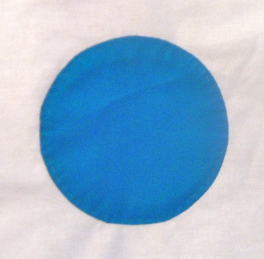 And newly started is this block for Cindy, who wants a white background with something that represents where we live in bright crayon colours. This is a pond as our house is called Pond House – fish to follow.