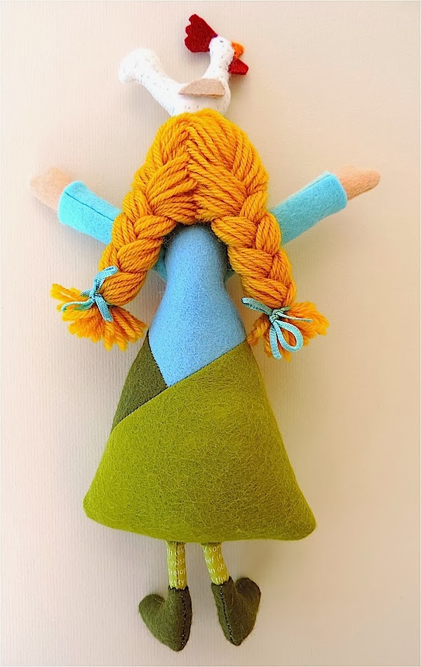 This week, I have been working on a couple of (still unfinished) secret projects and today I was going to share some tiny peeks of knitting and crochet but, as the weather and my internet connection don’t get along well and I was unable to link up with Le Challenge, I decided to post my Sunrise Girl here instead. Although I’ve been thinking of her as a sewing project, I’m giving her an honorary yarn status because she is made mostly from a wool blend felt, with some wool felt and her hair is anchor tapestry wool.