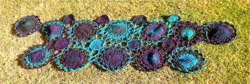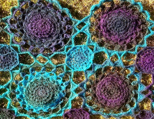 It is, however, approaching a wearable size, so I’ve decided I MUST get this finished up before I start any more yarn projects and I’ve started filling in the gaps with circles. I imagined them as sea pennies but they turn themselves into octagons and, I think/hope the effect is as nice as circles would have been. The octagons are also quick to make so, fingers crossed, they won’t take too long and then I’ll just have to find a way to edge it…