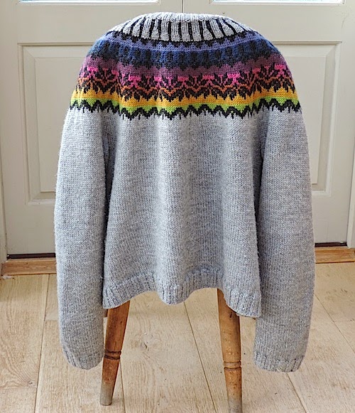 I used 4mm needles, the grey, blue and charcoal wools are Drops Karisma (dk weight) and for the other colours I used two stands of Drops Fabel (4ply weight), which I had left over from my miniature knits for the Granny Square, Knit and Purl characters. Two strands of 4ply should equal one strand of aran weight so that really shouldn’t have worked and I expected the tension might all go horribly wrong and that I’d have to frog the whole yoke.