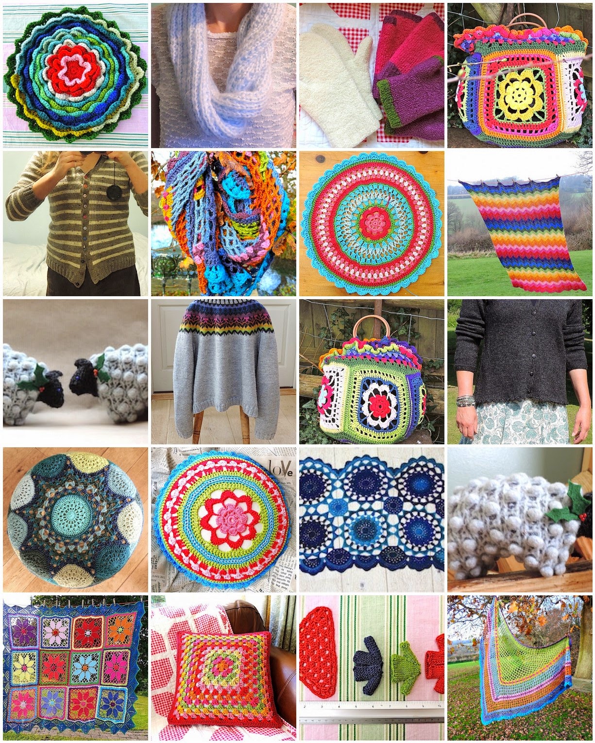 1. frilly crochet cushion, 2. knitted cowl, 3. felted mittens, 4. improv crochet bag 2, 5. simple stripes cardigan, 6. colourful crochet shawl, 7. circular crochet cushion 2, 8. crochet rainbow blanket, 9. upcycled heep 2, 10. Icelandic cardigan, 11. improv crochet bag 1, 12. simple cardi, 13. The unpopular one!, 14. circular cushion 1, 15. sea flowers shawl, 16. upcycled sheep, 17. flowerful crochet blamket, 18. granny cushion, 19. miniature knits, 20. colourful crochet shawl