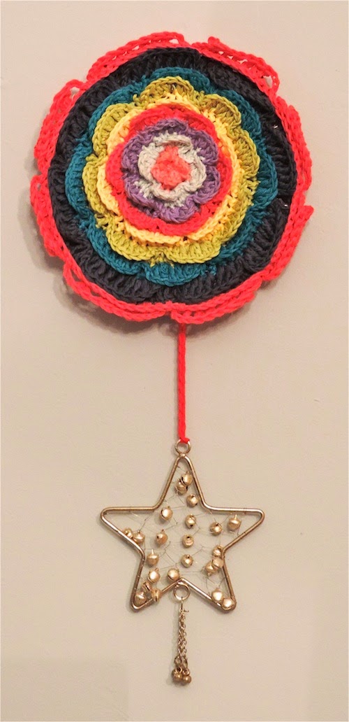 Seeing how a little crochet brightened up the room, I decided to salvage the failed purse and turn it into a little wall hanging.