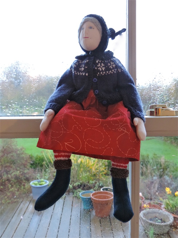 I have finished a doll for my lovely friend Benta, who blogs over at Slik Stitches. Really, I should post her but I have been hoping, these last few days, to take some photos for my blog, which is to say, I have been waiting for the sun to peep out.