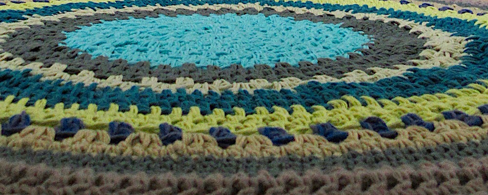 Unfortunately, she didn’t unravel all of it so I frogged the rest and, working two strands together, I crocheted a circle and made into a floor mat for our downstairs loo.