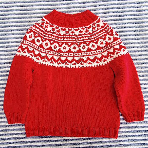 And, lastly, my favourite. A red and white Winter jumper for a little boy who is coming to stay at Christmas. I used a Drops Design pattern from Garn Studio, which you can find here. It is knitted in Drops Karisma.