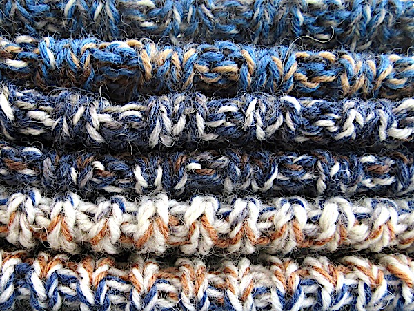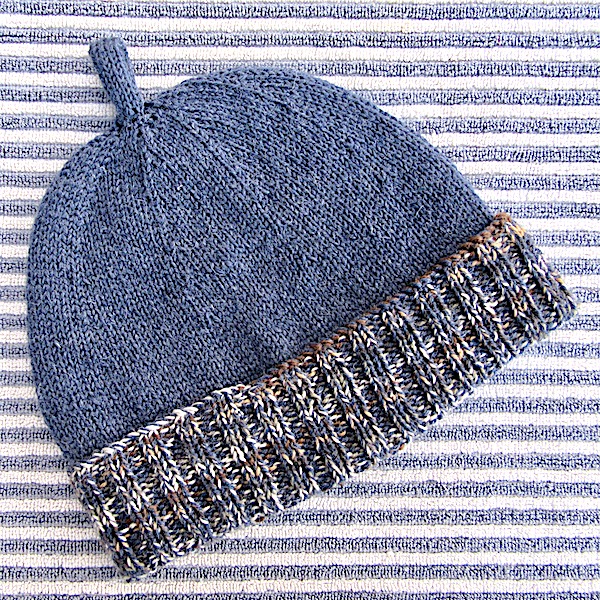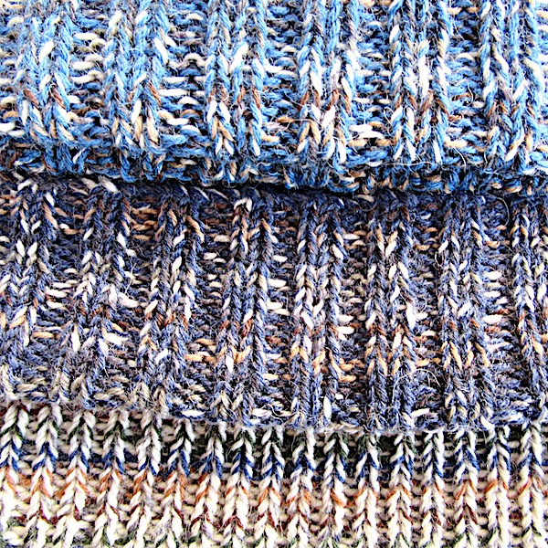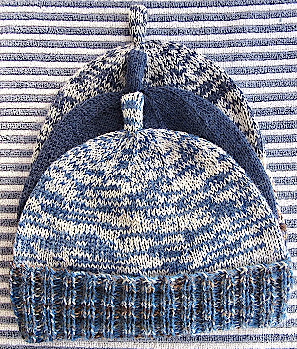 I’ve been trying to combine making Christmas presents with using yarn from stash and these hats enabled me to use the ends of some self-striping yarn with odd balls of 4ply. I used two strands together to make aran weight and blend the bands with the hat tops, if that makes sense.