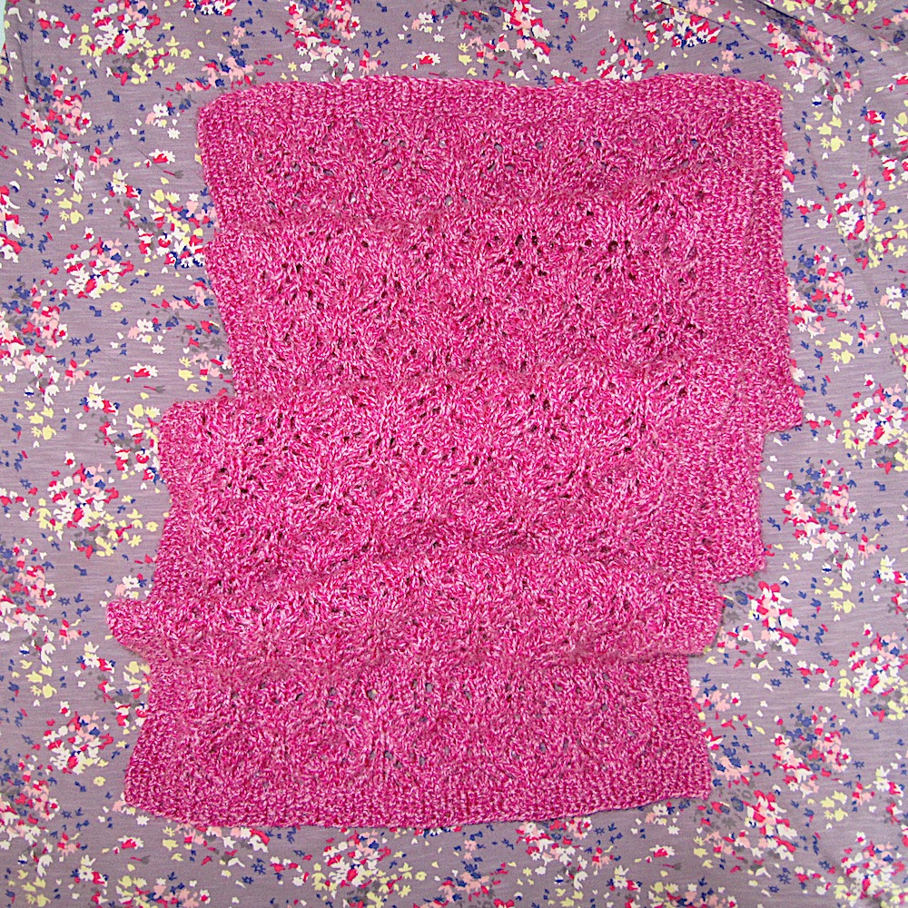 The pink stole, that I have been knitting for no good reason – except that I’m trying to find ways of using up stash yarn and I think I think it’s beneficial to do a little making every day to preserve one’s sanity – has grown as long as the yarn permits and is, consequently, finished.