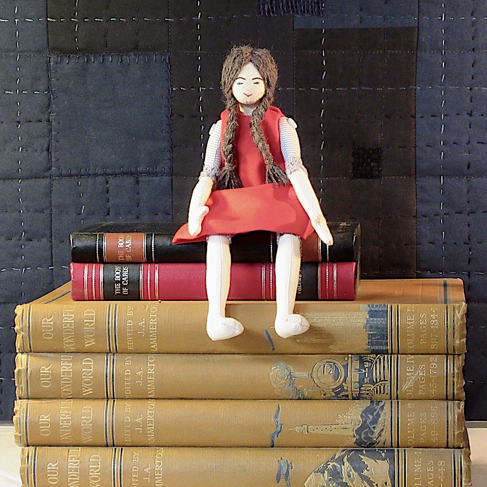 When I came to make my quilt, the size of the book/box was a challenge so I began with making Elsie, who is 3 1/2″ high. You can see the steps of her making in The Smallest Doll.