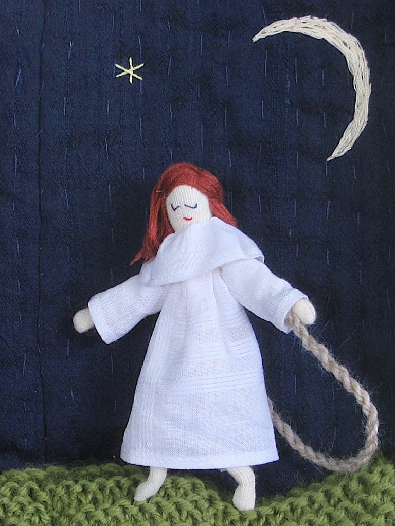 For the background I used a scrap of an old silk skirt (also used for the border of my last Endeavourers quilt) and added some simple hand quilting, the moon and the stars using sewing sewing thread. Then I knitted the grass and stuffed it lightly to make the scene a bit more three dimensional.
