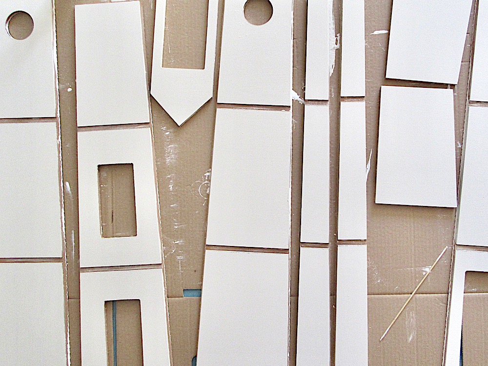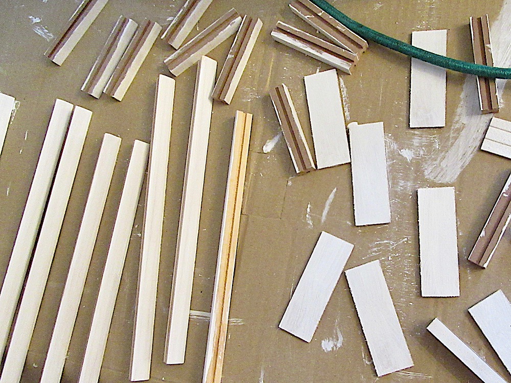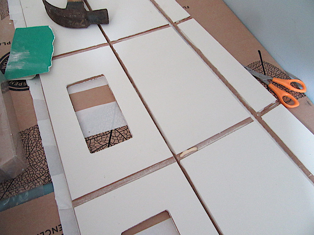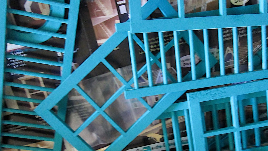 The kit seemed fairly straightforward. Paint all the pieces that were not to be glued, stick the body of the house together with masking tape, glue the grooves, position the floors fold it round and Bob’s your uncle! It suggested this is easier with two people so I enlisted a reluctant Mr RH, followed every instruction to the exact letter. And everything kept falling to pieces and nothing would stick – largely because the floors just didn’t fit into the grooves. In the end, after washing out all the glue twice, son # 3, who is a builder and has lots of carpentry experience glued the grooves, whacked the floors in with a hammer and nailed them for me and set it to dry with a bungee strap.