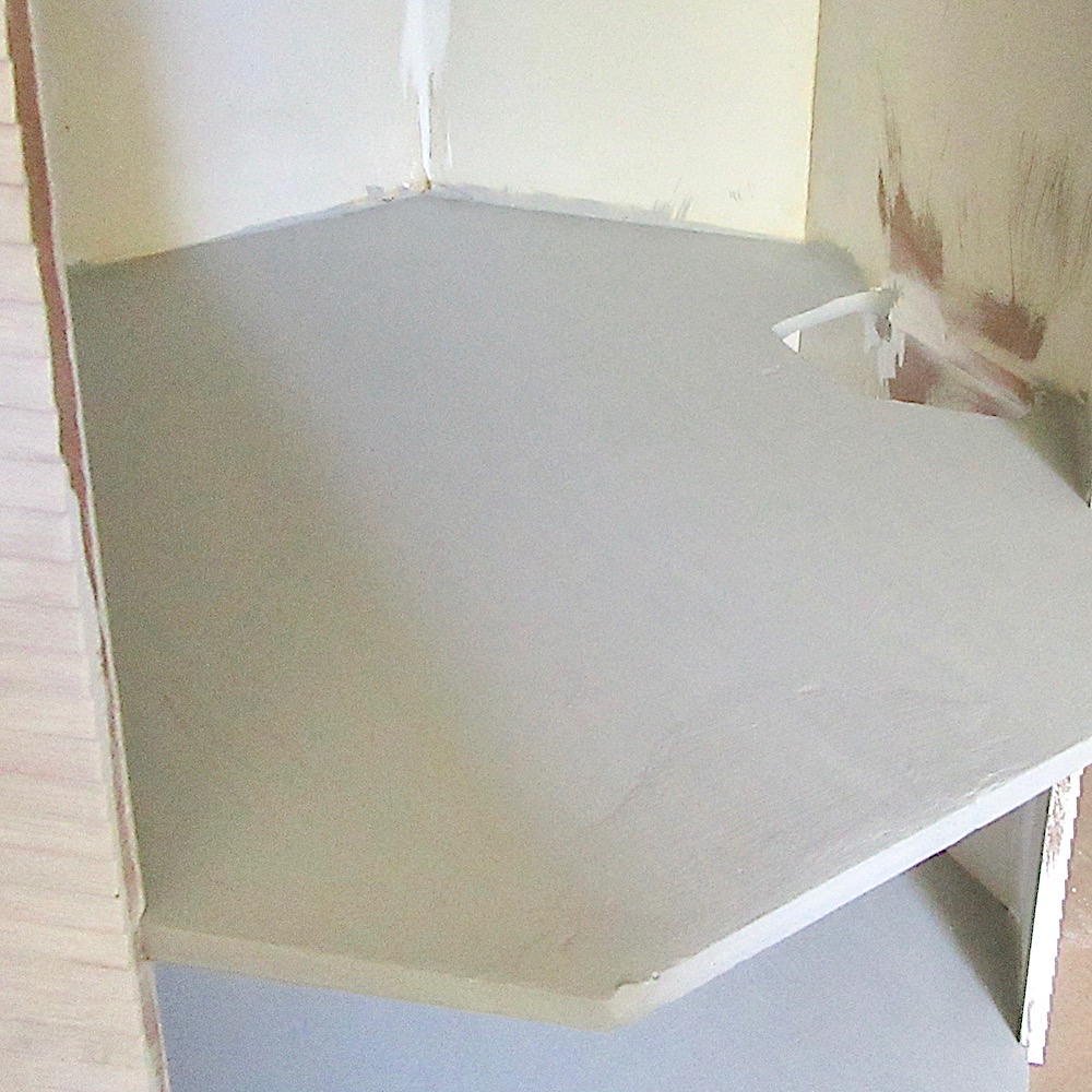 I decided on the only place the stairs could now go and, with considerable difficultly in the confined space, I cut (and sanded) a new hole for the stairs and made a piece the right size to fill the hole in the front and glued it in and filled it and sanded and painted it and re-painted it. And every stage had to wait to dry and it all took forever and eventually it started to look sort of ok.