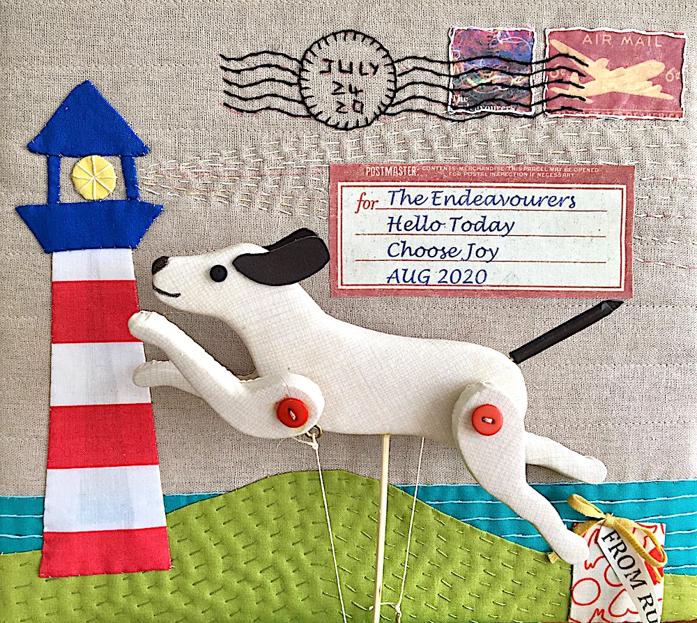 I decided to make the main quilt in the style of an altered envelope incorporating some of the things that have brought me joy during the pandemic. The envelope represents mail in general, whilst the present shows my package from Ruth and the dog represents all the dogs I have ever owned, who have taken such joy in running and leaping and exploring the world with unshakeable enthusiasm and optimism.