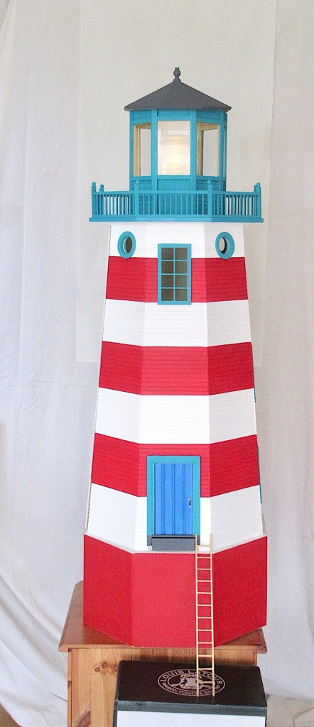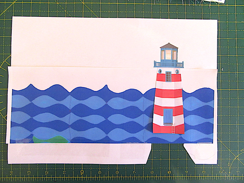 I then took a photo of my (still not quite finished) model lighthouse and cut that out to assemble a picture of the lighthouse and the sea, which I also scanned onto my computer.
