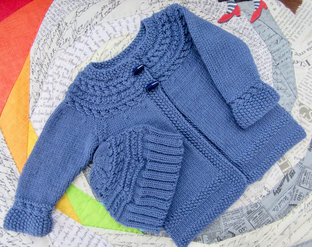 I suppose baby girls are inundated with pretty pink pretties, aren’t they. Why if I was a wee little bairn I would love to be pushed around in town sporting your gorgeous blue outfit. Such a pretty blue, Janine and the pattern is lovely. ‘Tis nice to see you knitting up a storm again. =)