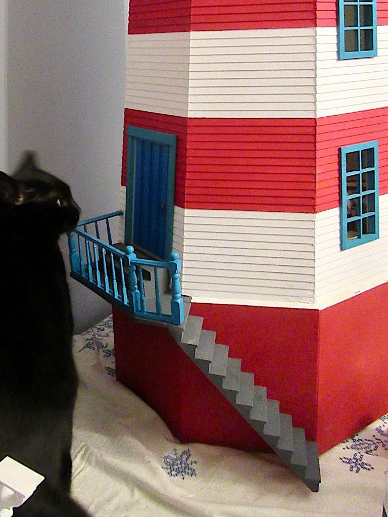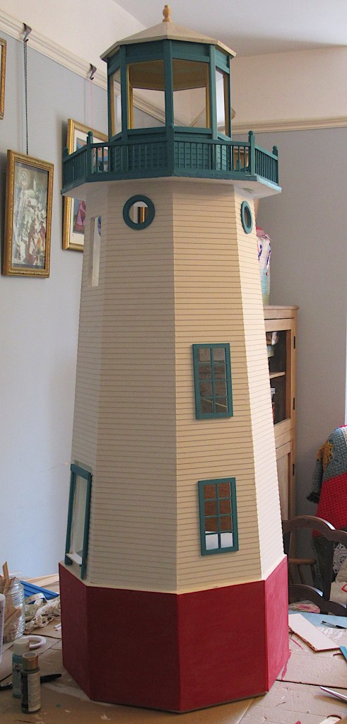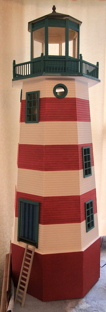 I love lighthouses and I love your project. Looks like you’re making it into a “dollhouse”? I dragged my sons to lighthouses up and down the East coast. 1st son joined USCG. When he left for basic he said “At least now you can’t drag me to anymore lighthouses”. He was assigned to ATN. This Florida boy was sent to Cape Cod in a frozen winter to start his career taking care of the lighthouse + other navigational aids. I couldn’t stop laughing. He wasn’t laughing. He even had to hang in some devise to paint it. Drag 2-50lb batteries to the top. He let us know “they’re not so romantic when you had to do the work I did”. He retired at age 39. And started a new career. Sorry this is long but you must love lighthouses to have one in your home.