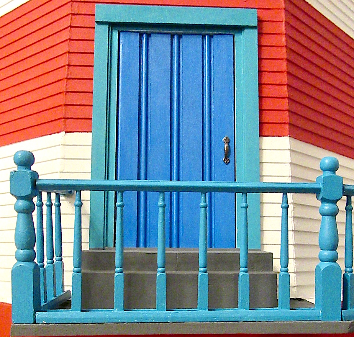 I then added the stairs inside – in the wrong places to accommodate the errors we made with wall placement (in Part 1) and I had to use a different door and remake the door frame to fit the space where the porch should have been. I also used some different windows (bought on ebay) because they were the right size and I I preferred the style.
