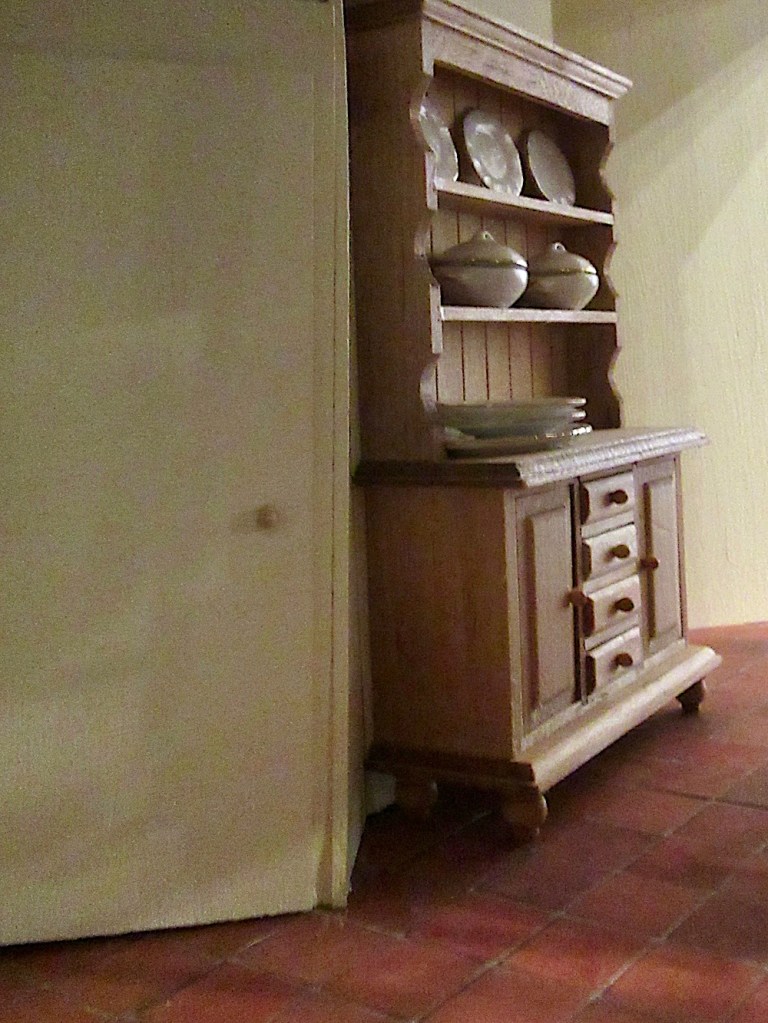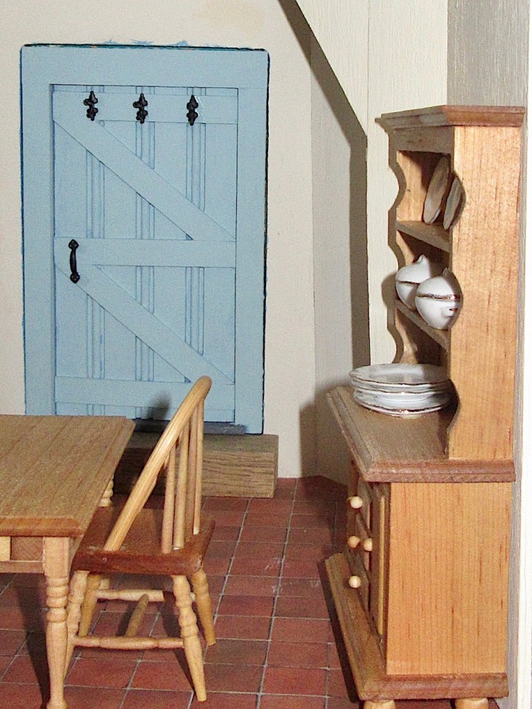 And, in the kitchen, I have added a ’tiled’ floor and boxed in the stairs to make a doorway to some (imaginary) stairs going down to the basement and a vertical wall so a dresser can fit in the room…