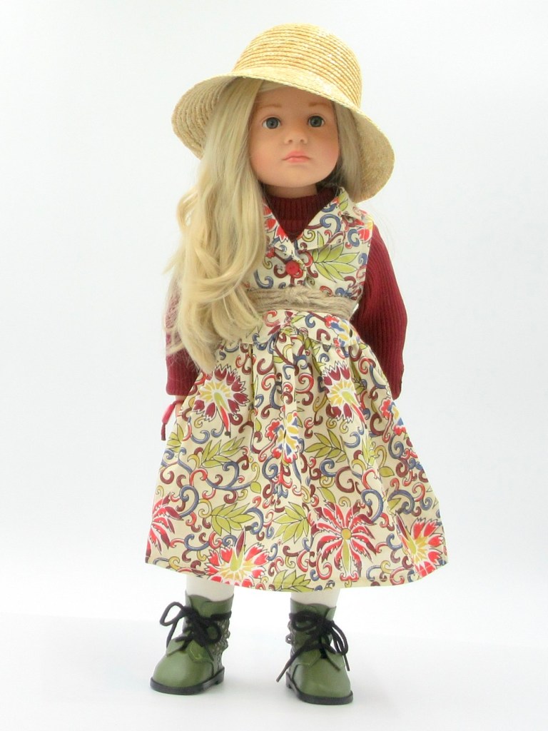As to why I bought her, I don’t really have any good explanation. I was just enchanted by all those dolls I looked at and, in another life, I would love to be a doll maker, or more precisely, a costumier for dolls. And after all the miniature things I’ve worked on lately, I feel it would just be nice to work with something a bit bigger and not so fiddly and, unless I actually do become a costumier for dolls in this life, it is only a few years before Freya can have her. So I selected the Happy Kidz range for size and poseability and the fact that they are toys, rather than a collectors items. And I chose Katie for her eyes, which are the same blue as mine and Freya’s. After having five children all with brown eyes, I am amazed to have a granddaughter with eyes just like mine so why not a doll as well? I also love her boots and hat!