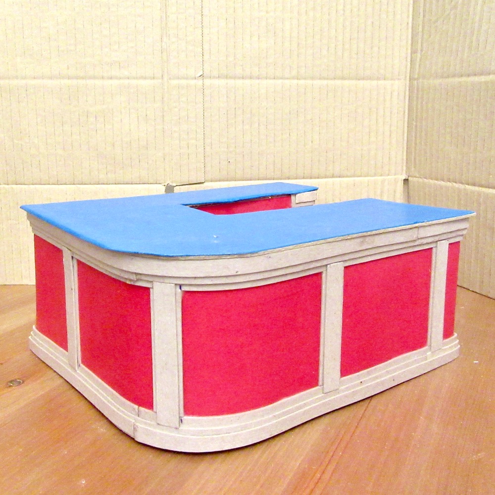 A long time ago I posted the beginnings of a bar I made from cardboard. I have eventually made a back for it using an upside-down wall shelf and the top of a door.