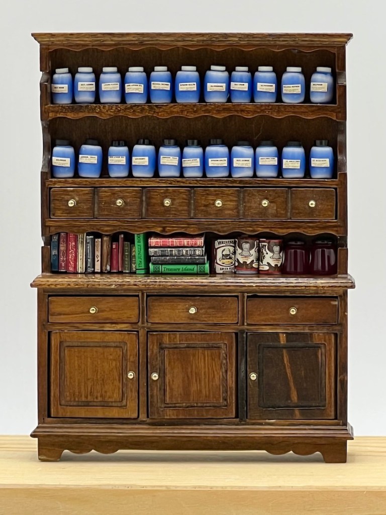 For the apothecary cupboard, I wanted to have rows of matching jars but buying miniature jars en masse is expensive and, in any case, finding any small enough to fit into this dresser seemed to be impossible. I eventually settled on making them from a string of beads with tiny buttons for lids and labels from The Graphics Fairy printed scaled at 13%. I’m quite pleased with how they turned out, though I will try to find something more interesting to go on the bottom shelf.
