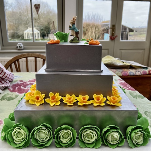 The fun part has been making the decorations from fondant and modelling icing. The photo on the left (of the stacked tins) was to work out how many more cabbages and daffodils I needed to make and it gives an idea of what I am aiming at.