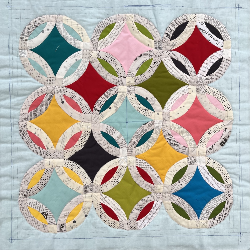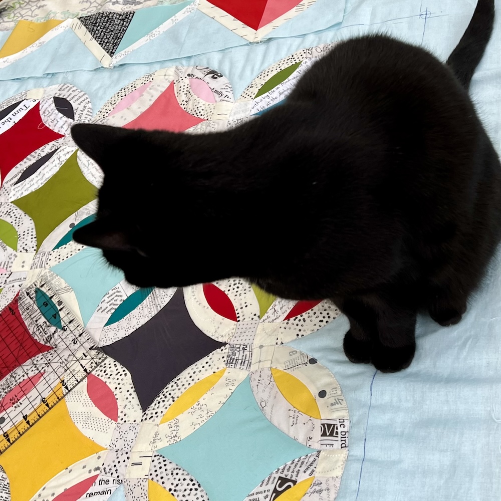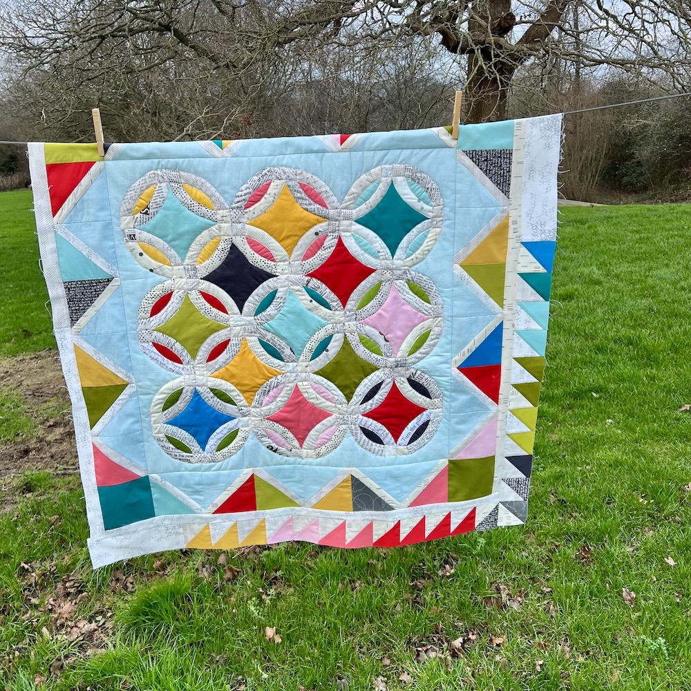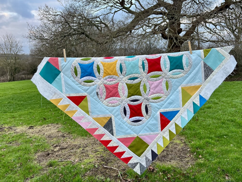 I had to get everything joined together and square before I could attach my signature blocks and then the wadding made it bulky and awkward to piece. Now I have quilted/sewn round all the double wedding ring circles but I need to add more wadding before I can quilt anymore and I’m going to wait to do that until I’ve added next week’s border.
