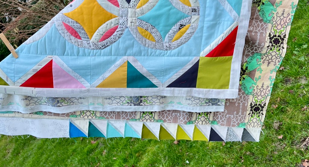 I’m loving your bright and happy quilt, Janine. Those HSTs are fabulous. Such a joyous quilt!