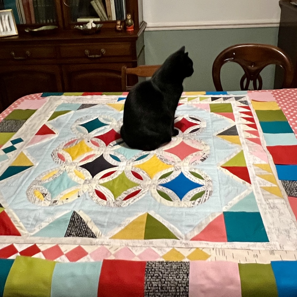 …But, when I laid them out on the dining table, I really wasn’t keen so, instead, I added 4 thin black borders and surrounded them with low volume squares.