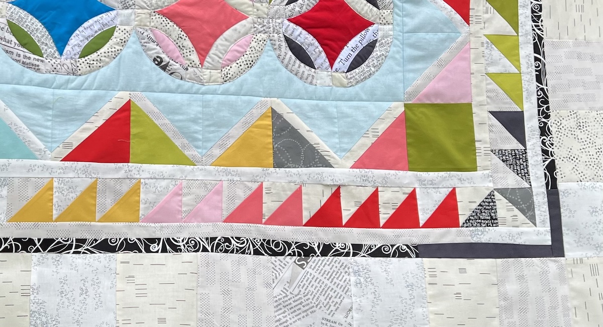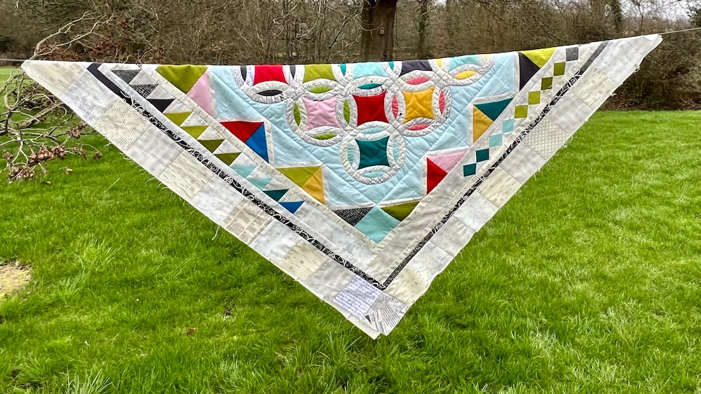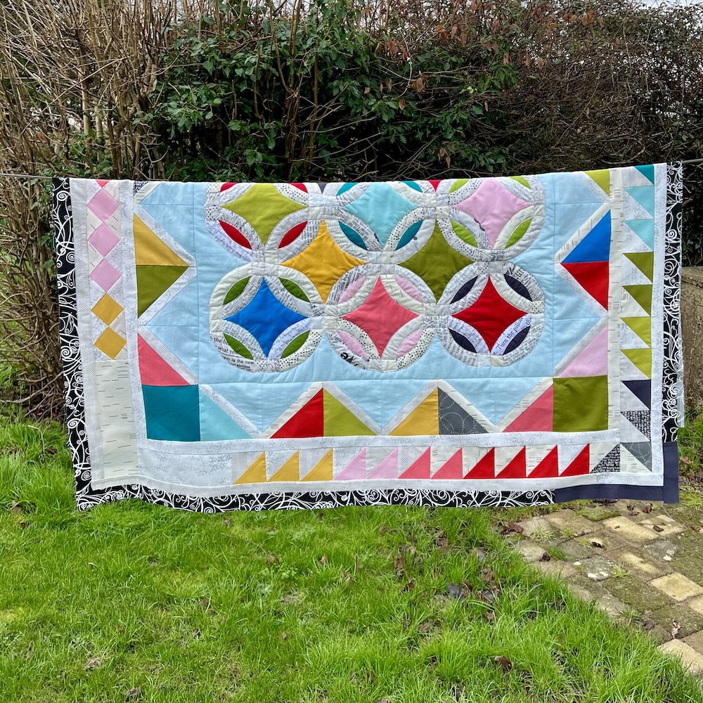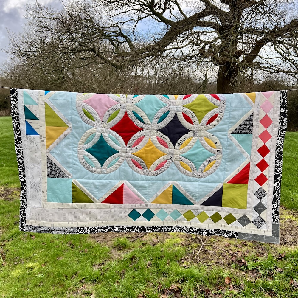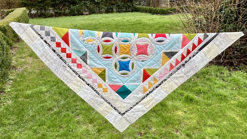 This is wonderful – I think you made the right choice between the colorful or the low volume border. The picture of it hanging outdoors is really pretty.