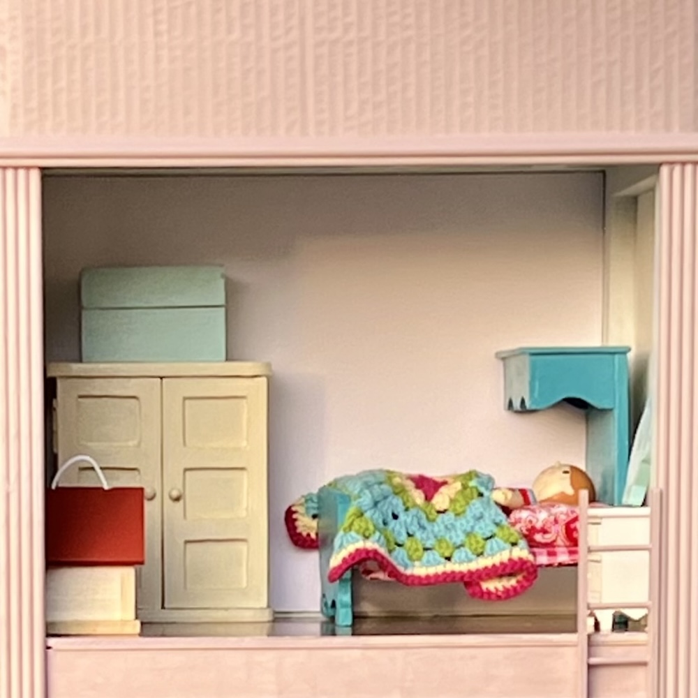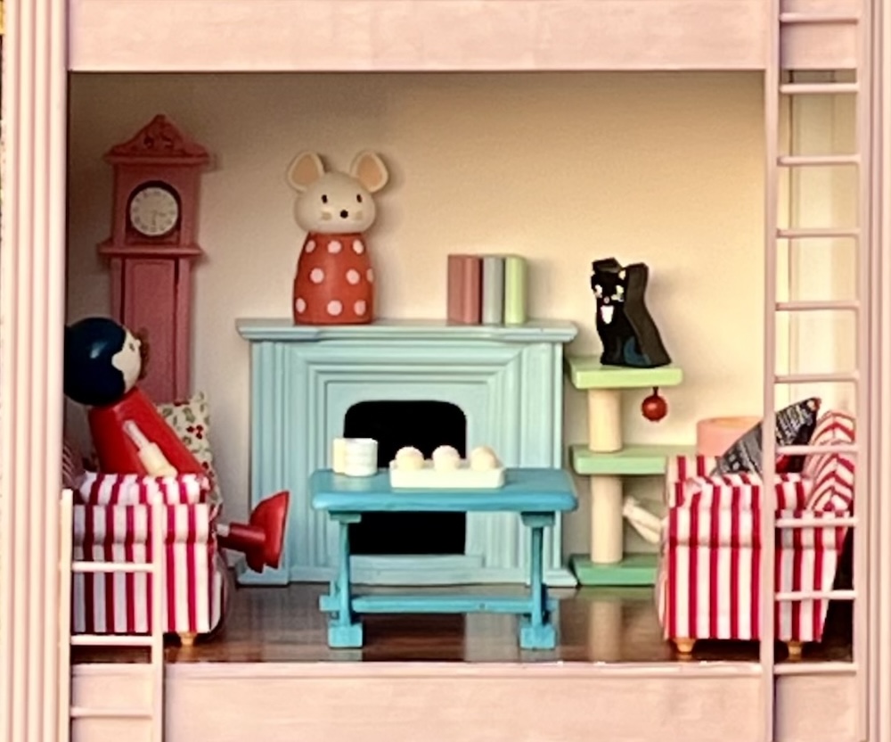 But, when I finally started to paint up the dollhouse I bought a long time ago on ebay and found a cupboard for it to stand on, I realised it is really too heavy and unstable to be safe for little children to play with. We will have to find somewhere for it to go on the floor or wait for the grandchildren to grow so, for the meantime, I made a cardboard castle. I built it around a wooden frame from a basket cabinet and it was very much inspired by the Maileg “Castle with Mirror”. I didn’t have wallpaper or get around to cutting openings but it fits in a selection of people and furniture and can easily be adapted in the future.