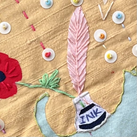 I made this using scraps of fused silk like the ‘Moon over Squircle’ I made for the ‘Circles and Squares’ theme last November. In that post I said: I’m quite enthused to try some more fusing silk, perhaps adding embroidery next time… Now I have and for good measure I added some beads and sequins.