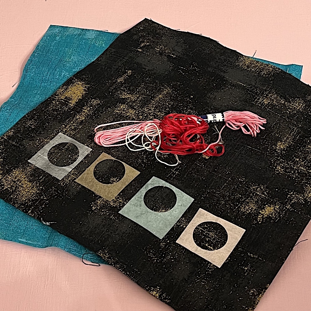 And so it was that a week last Monday – the day I was (again!) resolved to get started – I ended up helping my son the builder (who is currently making us a new drive and converting our garage into an annex) with coping stones and such like. This time, though, I was so determined that I painted two frames and in the evening I found some wool for a Christmas stocking and a tin of scraps from Moon over Squircle and I started making something which might be quilt or a book or a garland…