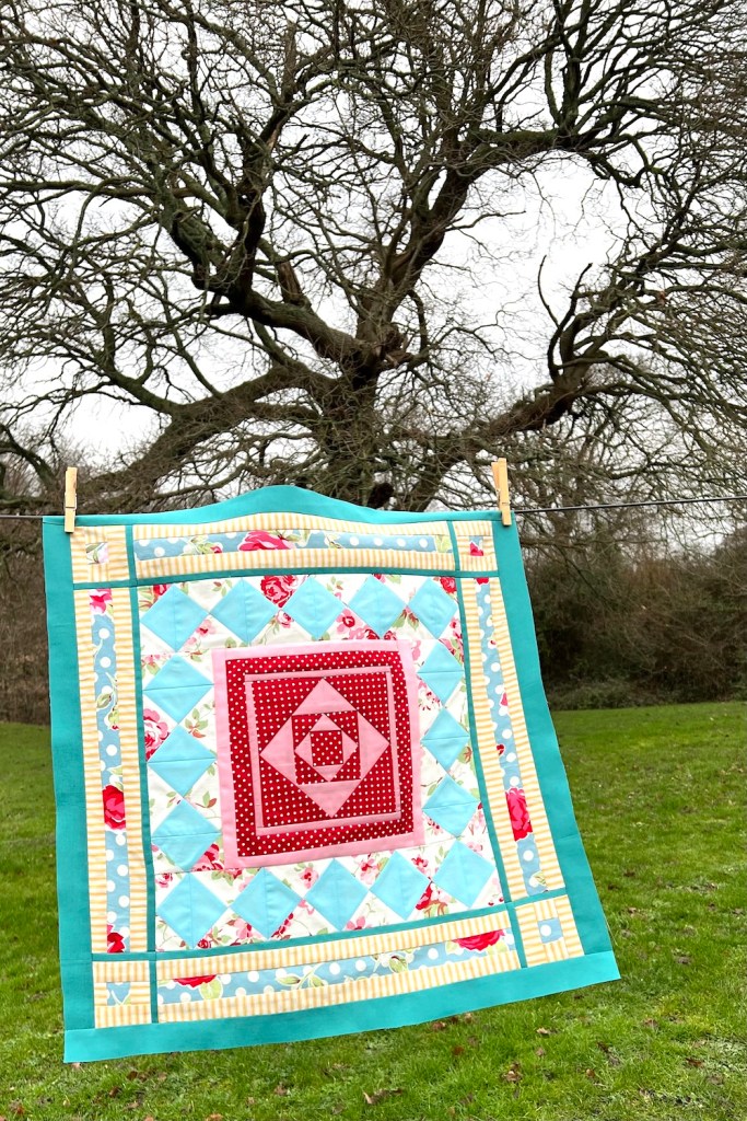 I’m a bit concerned that the centre is overpowering but, once I have trimmed the teal outer border, this will only be 21″ square so I hope to blend it all together at a later stage…