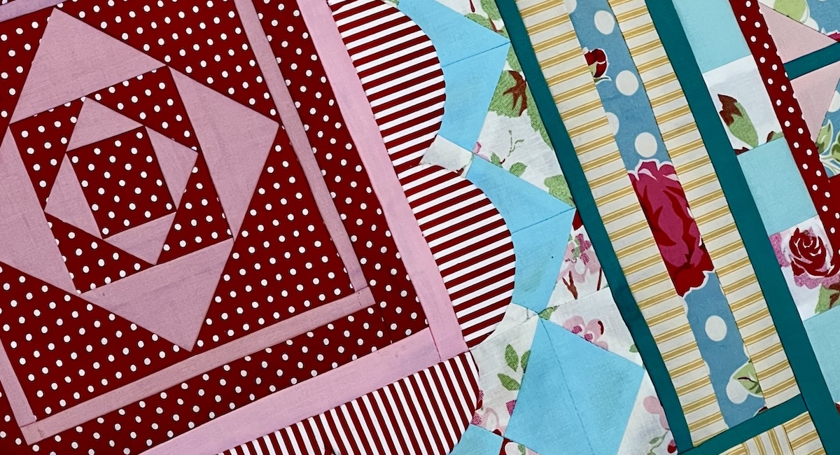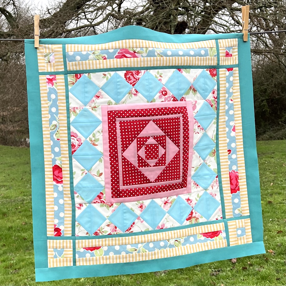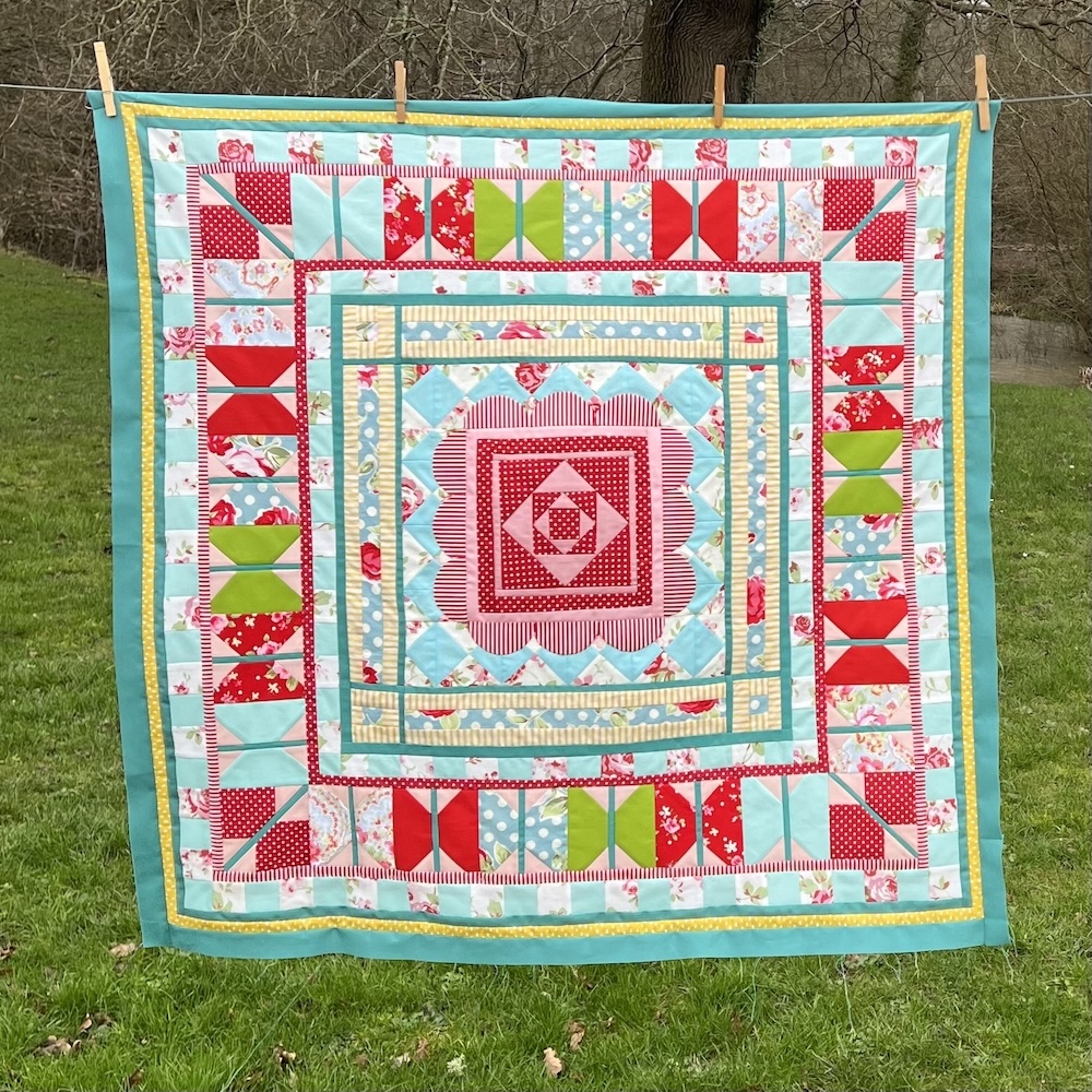 I added some more blue and white squares as sashing to give some space between my rounds and my SAHRR round this week is three simple stripes in two/three colours: teal and yellow with white spots. I agree that it needs a good press but I’m expecting a downpour any minute and this is a finished-is-better-than-perfect week.