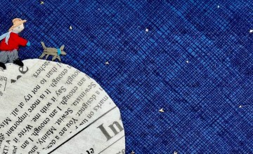 An art quilt with a boy, a sausage dog, a balloon and a plane…